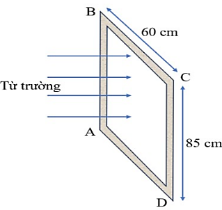 Khung nhôm của một cửa sổ hình vuông ABCD có kích thước 85 cm x 60 cm như hình bên. Cửa sổ có thể quay quanh bản lề được lắp dọc theo cạnh AB. Khi cửa đóng, thành phần nằm ngang của từ trường Trái Đất có độ lớn $B = 1,8.10^{- 4}T$ vuông góc với cửa sổ. Sau đó cửa được mở ra trong khoảng thời gian 0,20 s. Sau khi cửa mở ra, mặt phẳng ABCD song song với thành phần nằm ngang của từ trường Trái Đất.