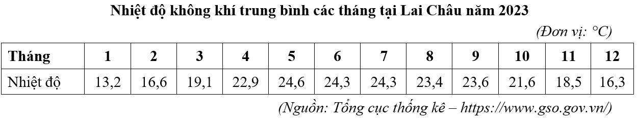 Theo bảng số liệu trên, tính biên độ nhiệt độ của trạm khí hậu Lai Châu năm 2023 (làm tròn kết quả đến một chữ số thập phân của °C).