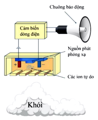 Hình vẽ bên dưới mô tả sơ đồ hoạt động đơn giản hoá của cảm biến báo khói ion hoá.