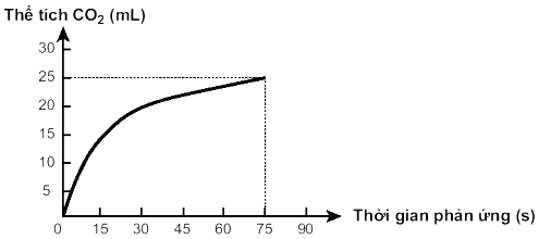 Thực hiện phản ứng sau: CaCO3 + 2HCl ⟶ CaCl2 + CO2 + H2O. Theo dõi thể tích khí CO2 thoát ra theo thời gian, thu được đồ thị như sau (thể tích khí được đo ở áp suất khí quyển và nhiệt độ phòng)