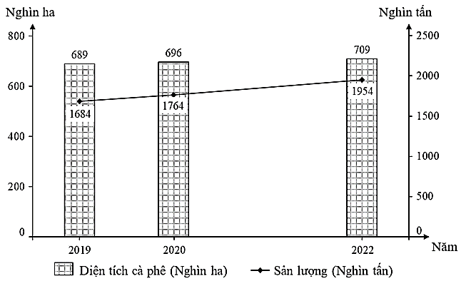 Cho biểu đồ sau: Diện tích và sản lượng cà phê của nước ta giai đoạn 2019 - 2022 (Nguồn: