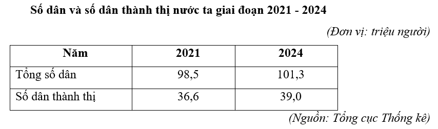 Cho bảng số liệu:Căn cứ vào bảng số liệu, hãy cho biết số dân nông thôn nước ta năm 2024
