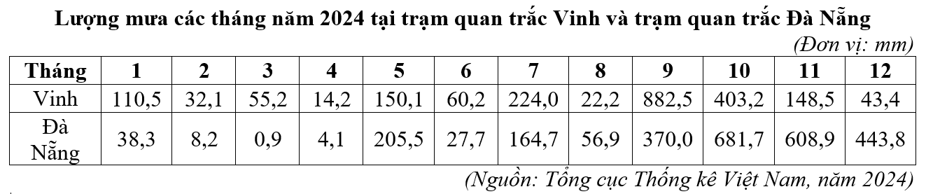 Căn cứ vào bảng số liệu trên, hãy cho biết năm 2024 tổng lượng mưa tại trạm quan trắc Đà Nẵng cao gấp mấy lần tổng lượng mưa tại trạm quan trắc Vinh (làm tròn kết quả đến một chữ số thập phân).