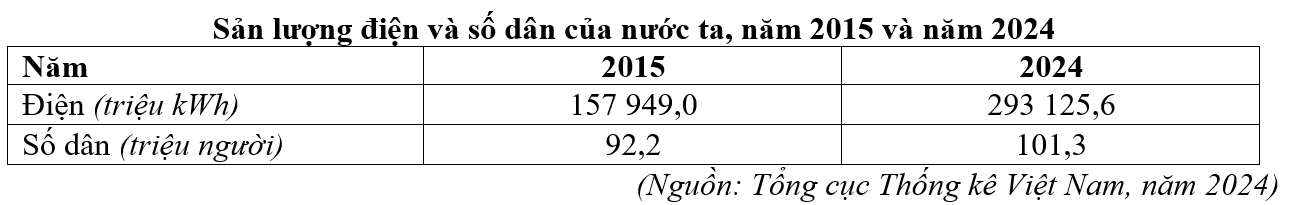 Căn cứ vào bảng số liệu trên, hãy cho biết sản lượng điện bình quân đầu người của nước ta năm 2024 so với năm 2015 tăng thêm bao nhiêu kWh/người (làm tròn kết quả đến hàng đơn vị).