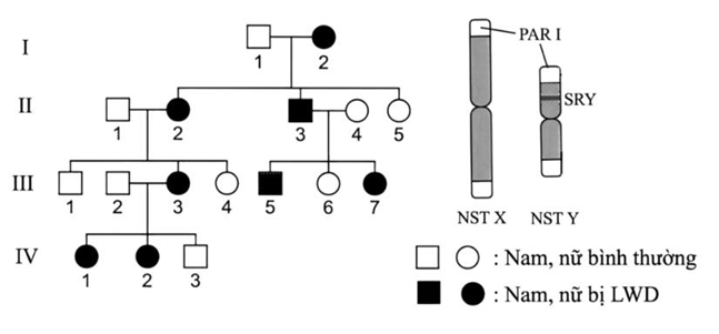 Ở người, chứng loạn sản sụn Leri Weill (LWD) do một allele đột biến của gene SHOX gây nên. Gene này gồm 2 allele, trội – lặn hoàn toàn, nằm trong vùng PAR1 của NST X và Y. Người mắc LWD thường có tầm vóc thấp do biến dạng xương chân; xương tay cũng có thể bị biến dạng. Sơ đồ phả hệ ở hình bên mô tả sự di truyền của LWD trong một gia đình. Qua phân tích, người ta thấy rằng trong quá trình giảm phân hình thành giao tử ở người II.3 đã xảy ra tiếp hợp và trao đổi đoạn NST giữa X và Y gây ra hoán vị gene. Hiện tượng này không xảy ra đối với những người khác trong phả hệ và không xuất hiện các đột biến khác. Khi nói về sự di truyền của LWD, phát biểu nào sau đây sai?