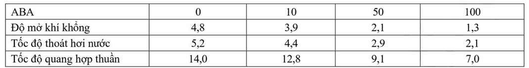 Một nhóm cây đậu tương (cùng tuổi, cùng số lá) được đặt trong buồng sinh trưởng ở 25°C, độ ẩm tương đối 60%, chiếu ánh sáng trong vùng 400 – 700 nm, cường độ 400 μmol photon m−2 s−1. Lá được phun dung dịch ABA với 4 nồng độ (0; 10; 50; 100 μM). Sau 30 phút, đo độ mở khí khổng (μm), tốc độ thoát hơi nước (mmol H2O m−2 s−1) và tốc độ quang hợp thuần (μmol CO2 m−2 s−1). Các yếu tố khác (tưới nước, dinh dưỡng, gió, thời điểm đo) được giữ ổn định. Kết quả được thể hiện ở Bảng 1.