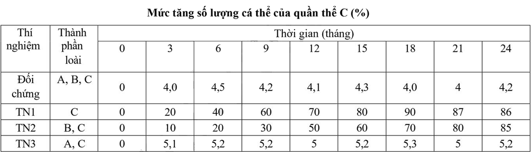 Để nghiên cứu sự ảnh hưởng của 2 loài A và B đến sự tăng trưởng của quần thể loài C, người ta tiến hành 4 thí nghiệm (TN) với điều kiện sinh thái như nhau nhưng thay đổi thành phần các loài nghiên cứu. Mức tăng số lượng cá thể của quần thể C so với thời điểm ban đầu được thể hiện qua Bảng 2: