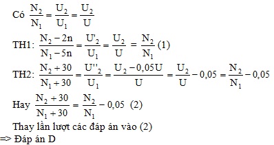 Mắc vào hai đầu cuộn dây sơ cấp của một máy tăng áp lý tưởng một điện áp xoay chiều có giá trị hiệu dụng không đổi U. Nếu đồng thời giảm số vòng dây ở cuộn sơ cấp 2n vòng và ở thứ cấp 5n vòng thì điện áp hiệu dụng ở cuộn thứ cấp để hở là không đổi so với ban đầu. Nếu đồng thời tăng 30 vòng ở cả hai cuộn thì điện áp hiệu dụng ở cuộn thứ cấp để hở thay đổi một lượng ∆U = 0,05U so với ban đầu. Số vòng dây của cuộn sơ cấp và thứ cấp tương ứng là:
