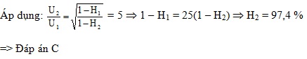 Điện năng cần truyền tải một công suất không đổi P từ nơi phát điện đến nơi tiêu thụ. Ban đầu thì hiệu suất truyền tải là 35%, sau đó tăng điện áp lên 5 lần thì hiệu suất truyền tải là: