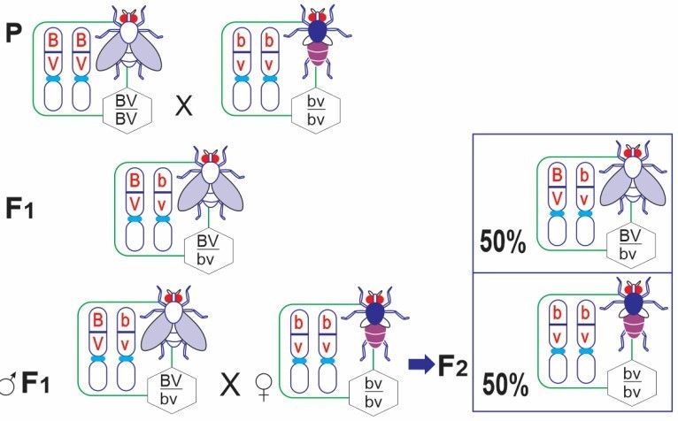 Sơ đồ sau tóm tắt cơ sở tế bào học của thí nghiệm Morgan, trong đó allele B quy định thân xám, b quy định thân đen; allele V quy định cánh dài, v quy định cánh cụt.