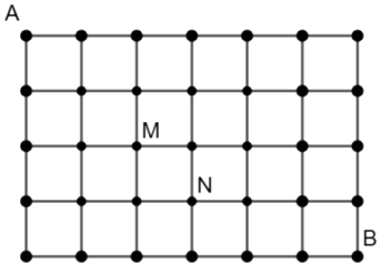 Trong một cuộc thi đấu Robotics, sân đấu được thiết kế dạng lưới ô vuông như hình vẽ. Các robot xuất phát từ vị trí điểm A, di chuyển ngẫu nhiên theo cạnh của các ô vuông theo hướng xuống dưới hoặc sang phải đến vị trí điểm B. Tính xác suất robot đi từ A đến B mà không đi qua cả M và N (kết quả làm tròn đến hàng phần trăm).