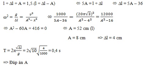 Một lò xo có chiều dài tự nhiên 36cm được treo thẳng đứng vào một điểm cố định, đầu dưới gắn vật nặng khối lượng m. Kích thích cho con lắc dao động điều hòa theo phương thẳng đứng. Trong quá trình dao động, chiều dài cực đại của lò xo bằng 1,5 lần chiều dài cực tiểu. Tại thời điểm t vật đi qua vị trí li độ 4cm và có tốc độ 20π