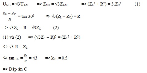 Đặt điện áp u = U0cos100πt vào hai đầu đoạn mạch AB theo thứ tự gồm một tụ điện C, cuộn cảm thuần L và điện trở thuần R mắc nối tiếp. Gọi M là điểm nối giữa tụ điện và cuộn cảm. Biết điện áp hiệu dụng của đoạn mạch MB gấp √3 lần điện áp hiệu dụng của đoạn mạch AM và cường độ dòng điện lệch pha π/6 so với điện áp hai đầu đoạn mạch. Hệ số công suất của đoạn mạch MB là