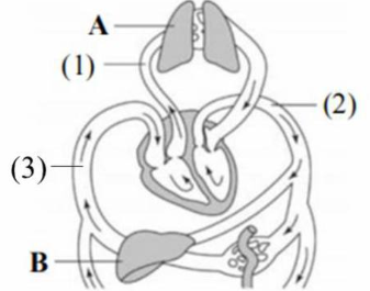 Hình dưới đây minh hoạ một phần con đường lưu thông máu ở cơ thể người. Các kí hiệu (1), (2) và (3) chỉ ba loại mạch máu; hai vị trí A và B chỉ hai cơ quan.