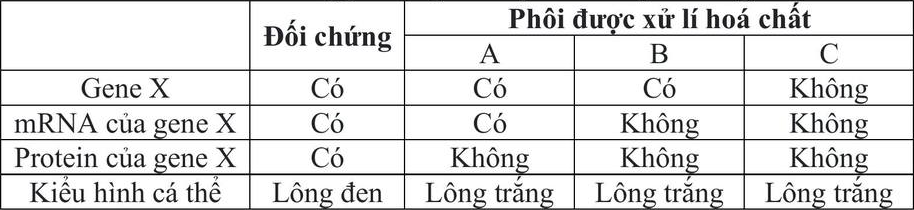 Ở một loài thú, gene X mã hoá protein X có chức năng tổng hợp sắc tố đen, làm cho mắt, lông đều có màu đen. Trong quá trình phát triển của cá thể, nếu ở giai đoạn phôi bị nhiễm 1 trong các loại hoá chất A, B, C thì phôi sẽ phát triển thành cá thể bị bạch tạng (không có khả năng tổng hợp sắc tố đen). Để nghiên cứu tác động của hoá chất A, B, C, người ta tiến hành xử lí các phôi bằng từng loại hoá chất riêng biệt, phôi đối chứng không được xử lí hoá chất, sau đó kiểm tra sự có mặt của gene X, mRNA, protein trong tế bào phôi và quan sát kiểu hình của các cá thể con sinh ra từ những phôi này. Kết quả thu được ở bảng sau: