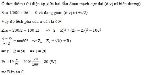 Cho đoạn mạch gồm điện trở thuần R = 30Ω, cuộn dây không thuần cảm và tụ điện C mắc nối tiếp, đặt vào hai đầu đoạn mạch điện áp xoay chiều có giá trị hiệu dụng U = 200V, tần số 50Hz thì cường độ dòng điện trong mạch có giá trị hiệu dụng I = 2 A . Biết tại thời điểm t (s), điện áp tức thời của đoạn mạch là u = 200√2 V thì ở thời điểm (t + 1/600) (s) cường độ dòng điện trong mạch i = 0 và đang giảm. Công suất tỏa nhiệt của cuộn dây là