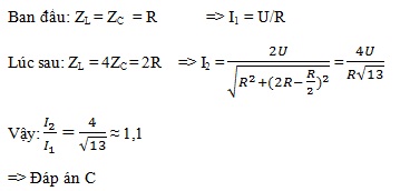 Nối hai cực của một máy phát điện xoay chiều một pha vào hai đầu đoạn mạch nối tiếp gồm điện trở thuần R, cuộn dây cảm thuần L và tụ điện C. Bỏ qua điện trở các cuộn dây máy phát. Khi rôto của máy quay đều với tốc độ n vòng/phút thì cảm kháng bằng dung kháng và bằng điện trở thuần R. Nếu rôto của máy quay đều với tốc độ 2n vòng/phút thì cường độ dòng điện hiệu dụng trong mạch sẽ