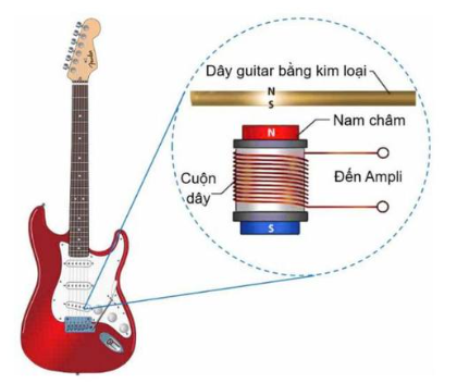 Trong đàn guitar điện, pickup là một thiết bị cảm biến âm thanh được lắp đặt trên cây đàn guitar, giúp chuyển đổi các dao động của dây đàn thành tín hiệu điện. Tín hiệu này sau đó được truyền đến ampli hoặc hệ thống âm thanh để phát ra âm thanh từ đàn guitar như hình. Giả sử rằng một cuộn dây của bộ thu (pickup) có 500 vòng và diện tích mỗi vòng là $50\text{cm}^{2}$. Khi dây đàn dao động, từ trường biến thiên với tần số $440\text{Hz}$ và cảm ứng từ có độ lớn $0,04\text{T}$. Suất điện động cảm ứng hiệu dụng trong cuộn dây của bộ thu khi dây đàn dao động có độ lớn xấp xỉ bằng