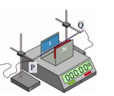 Một đoạn dây dẫn nằm ngang được giữ cố định ở vùng từ trường đều trong khoảng không gian giữa hai cực của nam châm. Nam châm này được đặt trên một cái cân như hình vẽ. Phần nằm trong từ trường của đoạn dây dẫn có chiều dài là 10 cm. Khi không có dòng điện chạy trong đoạn dây, số chỉ của cân là 600,16 g. Khi có dòng điện cường độ 1,53 A chạy trong đoạn dây, số chỉ của cân là 601,55 g. Lấy g = 9,80 m/s².