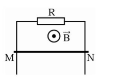 Hai thanh kim loại song song, thẳng đứng có điện trở không đáng kể, một đầu nối vào điện trở $R = 1,2\Omega$. Một đoạn dây dẫn MN có chiều dài $\mathcal{l} = 20\text{cm}$ khối lượng $m = 2,5\text{g}$ điện trở $r = 0,3\Omega$ tì vào hai thanh kim loại. Thanh MN có thể trượt không ma sát xuống dưới và luôn luôn vuông góc với hai thanh kim loại đó. Hệ thống đặt trong từ trường đều có hướng vuông góc với mặt phẳng chứa hai thanh kim loại, có cảm ứng từ $B = 0,2\text{T}$, chiều cảm ứng từ như hình vẽ. Biết rằng khi thanh kim loại chuyển động cắt các đường sức từ tạo ra suất điện động cảm ứng trong thanh được xác định là $e_{c} = B\mathcal{l}v\sin\alpha$. Trong đó B là cảm ứng từ của từ trường, $\mathcal{l}$ chiều dài thanh kim loại, v là tốc độ chuyển động của thanh, góc $\alpha$ là góc tạo bởi $\overset{\rightarrow}{B}$ và hướng chuyển động của thanh. Lấy $g = 10\text{m/s}^{2}$. Tốc độ của thanh khi thanh chuyển động thẳng đều là bao nhiêu m/s? (Kết quả làm tròn đến chữ số hàng phần mười).