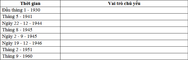 Bằng kiến thức đã học trong bài “Hồ Chí Minh - Anh hùng giải phóng dân tộc”, hãy xác định vai trò chủ yếu của Hồ Chí Minh đối với cách mạng Việt Nam theo mẫu sau: