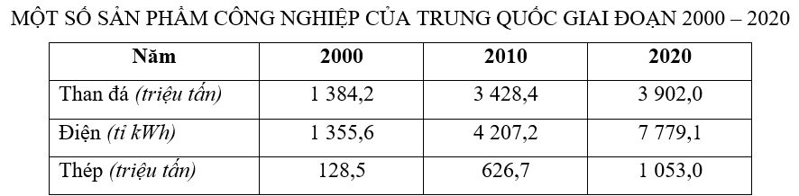 Dựa vào bảng số liệu và nhận xét về sự thay đổi sản lượng một số sản phẩm công nghiệp của Trung Quốc giai đoạn 2000 - 2020.