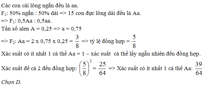 Ở một loài vật nuôi, gen A nằm trên NST thường quy định lông dài trội hoàn toàn so với a quy định lông ngắn, ở một trại nhân giống, người ta nhập về 15 con đực lông dài và 50 con cái lông ngắn. Cho các cá thể này giao phối tự do với nhau sinh ra F1 có 50% cá thể lông ngắn. Các cá thể F1 giao phối tự do được F2. Biết rằng không xảy ra đột biến. Lấy ngẫu nhiên 2 cá thể ở F2, xác suất để thu được ít nhất 1 cá thể dị hợp là bao nhiêu?