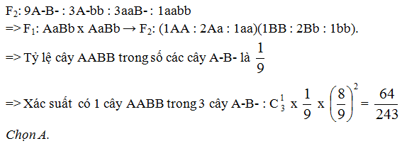 Cho biết mỗi cặp tính trạng do một cặp gen quy định. Cho cây thân cao, hoa đỏ giao phấn với cây thân thấp, hoa trắng được F1 gồm 100% cây thân cao, hoa đỏ. Cho F1 tự thụ phấn đời F2 có tỉ lệ 56,25% cây thân cao, hoa đỏ: 18,75% cây thân cao, hoa trắng: 18,75% cây thân thấp, hoa đỏ: 6,25% cây thân thấp, hoa trắng. Ở F2, lấy ngẫu nhiên 3 cây thân cao, hoa đỏ, xác suất để thu được 1 cây thuần chủng là