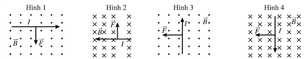 Hình vẽ nào sau đây xác định đúng lực từ tác dụng lên đoạn dây dẫn có dòng điện nằm