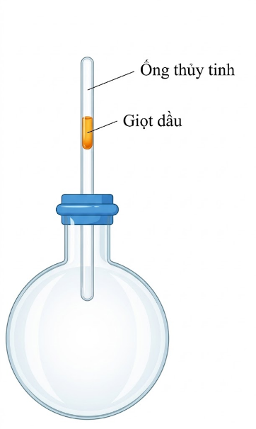 Hình dưới vẽ một bình chứa không khí. Không khí bị giữ lại bởi một giọt dầu trong ống hẹp. Khi bình nóng lên, giọt dầu trong ống dâng lên. Phát biểu nào dưới đây không chính xác?