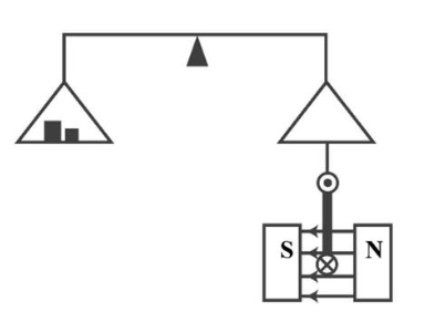 Hình vẽ bên minh họa một thí nghiệm khảo sát tác dụng của lực từ lên dây dẫn mang dòng điện: Khung dây dẫn phẳng hình vuông cạnh $a = 10\text{cm}$ gồm 100 vòng được treo thẳng đứng dưới một đĩa cân bằng dây cách điện. Cạnh dưới của khung nằm ngang trong từ trường đều của nam châm và vuông góc với đường sức từ, các cạnh còn lại coi như không chịu ảnh hưởng của từ trường. Dòng điện chạy qua cạnh dưới của khung có cường độ $I = 0,5\text{A}$ và có phương vuông góc với mặt phẳng hình vẽ, chiều hướng vào trong. Khoảng cách từ điểm treo hai đĩa cân đến trục quay là bằng nhau. Ban đầu phải đặt quả cân lên đĩa bên trái để đòn cân thăng bằng. Sau đó đảo ngược các cực từ của nam châm để đổi chiều của đường sức từ, để cân thăng bằng trở lại phải thêm vào đĩa cân bên trái một quả cân có khối lượng $150\text{g}$. Cho biết gia tốc trọng trường $g = 10\text{m/s}^{2}$. Tính độ lớn cảm ứng từ trong lòng của nam châm ra đơn vị tesla (kết quả làm tròn đến chữ số hàng phần trăm).