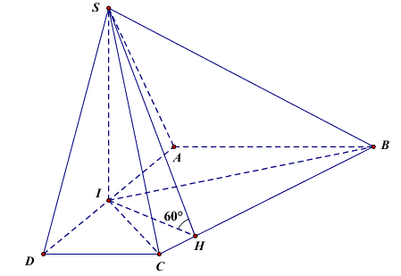 Cho hình chóp S.ABCD có đáy ABCD là hình thang vuông tại A và D, $AB = AD = 2CD = 2a$. Góc giữa hai mặt phẳng (SBC) và (ABCD) bằng $60^{0}$. Gọi I là trung điểm AD. Biết hai mặt phẳng (SBI) và (SCI) cùng vuông góc với mặt phẳng (ABCD). Thể tích khối chóp S.ABCD là
