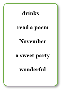 It is Teachers’ Day next week. In Viet Nam, we celebrate it on the 20th of (0) November. This year, we will have a celebration and a party in our class. There will be a lot of meaningful activities. First, Mai and Lan will (1) ________________ to say thank you to our teachers. Then, Minh and Linh will sing a song about the teachers. Phong and Huong will give our teachers small gifts. There will be (2) ________________ after the celebration. We will have a lot of food and (3) ________________ such as pizza, salads, popcorn, apple juice and lemonade. It will be a (4) ________________ party.