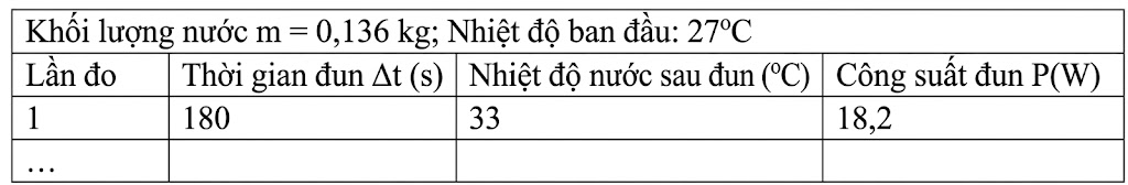 c) Với kết quả thí nghiệm đo trong lần 1, nhóm học sinh xác định được nhiệt dung riêng của nước là 4014,71 J/kg.K![]() |