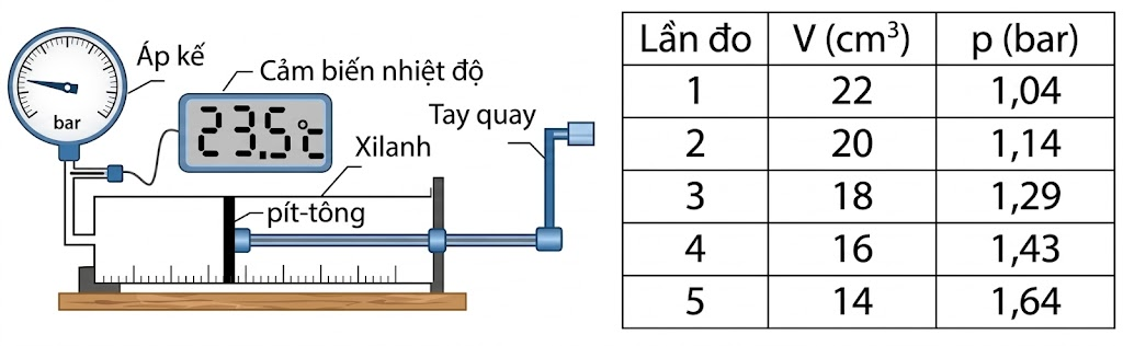 | a) Trình tự thí nghiệm: Nén (giữ nguyên nhiệt độ) khí trong xilanh; Ghi giá trị thể tích và giá trị áp suất khí; Lặp lại các thao tác. | ||