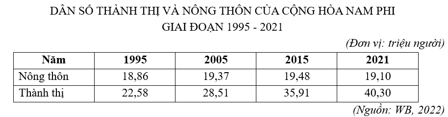 | a) Biểu đồ thích hợp để thể hiện chuyển dịch cơ cấu dân số thành thị và nông thôn của Cộng hòa Nam Phi giai đoạn 1995 – 2021 là biểu đồ miền, tròn. | ||