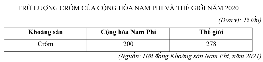 Căn cứ vào bảng số liệu trên, hãy cho biết trữ lượng khoáng sản crôm của Cộng hòa Nam Phi so với thế giới năm 2020 là bao nhiêu phần trăm (làm tròn kết quả đến số thập phân thứ hai)