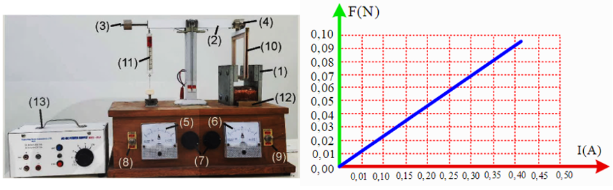 Một bộ thí nghiệm dùng trong thực hành đo độ lớn cảm ứng từ bằng cân "dòng điện" như hình vẽ. Kết quả thí nghiệm được biểu diễn bởi đồ thị quan hệ F và I như hình dưới đây: