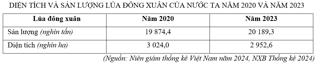 Căn cứ vào bảng số liệu trên, hãy cho biết năng suất lúa đông xuân trung bình của nước ta năm 2023 so với năm 2020 tăng thêm bao nhiêu tạ/ha (làm tròn kết quả đến hai chữ số thập phân).