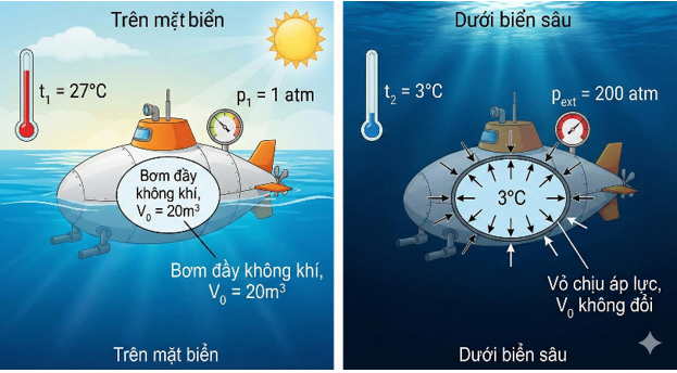 Một tàu ngầm nghiên cứu biển sâu có thể tích khoang chứa khí là $V_{0} = 20m^{3}$. Ở trên mặt biển ( $t_{1} = 27^{0}C$, $p_{1} = 1atm$ ), người ta bơm đầy không khí vào tàu. Khi lặn xuống độ sâu mà áp suất nước bên ngoài là $p_{ext} = 200atm$ , nhiệt độ nước biển là $t_{2} = 3^{{^\circ}}C$ . Vỏ tàu chịu áp lực cực lớn nhưng coi như thể tích khoang không đổi.