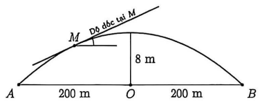 Hình vẽ dưới đây mô tả một cây cầu vượt có mặt cắt đứng là một phần parabol nối hai điểm A, B và nhận đường trung trực của đoạn AB làm trục đối xứng, AB = 400 m. Khoảng cách từ đỉnh cây cầu đến AB bằng 8 m. Xét tiếp tuyến d tại điểm M trên mặt cầu, người ta quy ước $\tan(\Delta,d)$ là độ dốc tại M của mặt cầu, với $\Delta$ là đường thẳng đi qua hai điểm A, B. Độ dốc lớn nhất của mặt cầu là bao nhiêu?