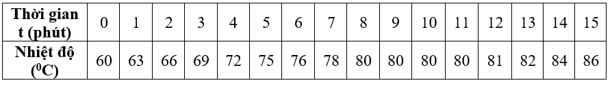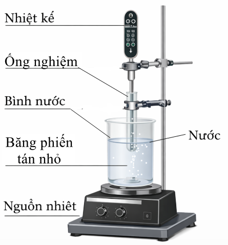 Để tìm hiểu sự nóng chảy của băng phiến, một nhóm học sinh đã tiến hành thí nghiệm với bố trí như hình bên. Một lượng băng phiến tán nhỏ ở trạng thái rắn được cho vào ống nghiệm, sau đó đặt ống nghiệm thẳng đứng sao cho phần ống nghiệm chứa băng phiến ngập hoàn toàn trong nước. Bình nước được đun nóng liên tục bằng nguồn nhiệt (bếp điện). Trong suốt quá trình đun, nhiệt độ của băng phiến được theo dõi bằng nhiệt kế gắn cố định trên giá đỡ, đảm bảo đầu đo tiếp xúc hoàn toàn với mẫu băng phiến. Khi nhiệt độ của băng phiến đạt 60°C, nhóm học sinh bắt đầu ghi lại số liệu nhiệt độ sau mỗi 1 phút, đồng thời quan sát trạng thái của mẫu chất. Quá trình đo kết thúc khi nhiệt độ băng phiến đạt 86°C. Kết quả thu được trình bày trong bảng sau: