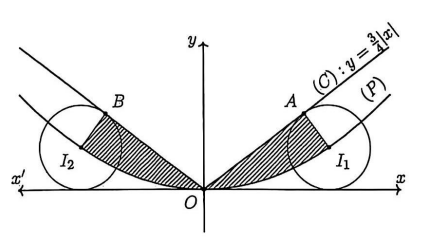 Tính diện tích của hình phẳng giới hạn bởi (C), (P) và các đường thẳng I_1A, I_2B.