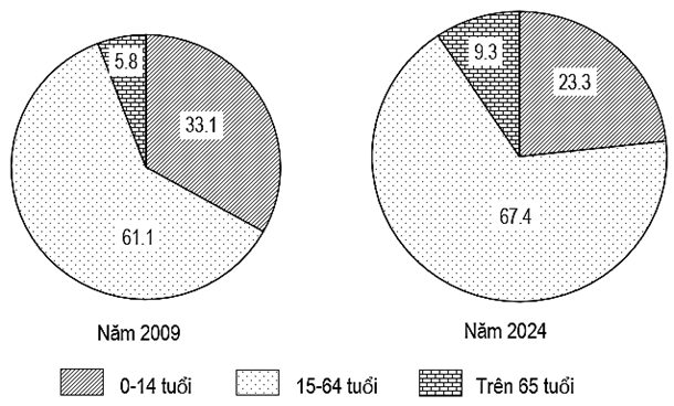 Cơ cấu dân số theo tuổi nước ta năm 2009 và năm 2024 (Đơn vị: %)