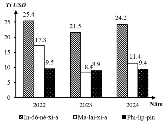 | c) Năm 2024, số vốn đầu tư trực tiếp nước ngoài của Ma-lai-xi-a nhỏ hơn của In-đô-nê-xi-a và nhỏ hơn của Phi-lip-pin. | ||