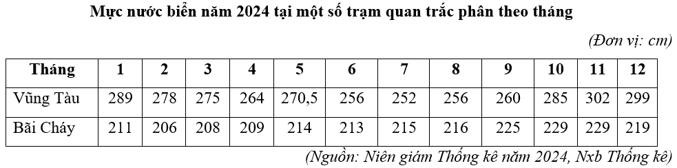 Căn cứ bảng số liệu, hãy cho biết mực nước biển của tháng có mực nước cao nhất tại trạm quan trắc Vũng Tàu cao hơn mực nước biển của tháng có mực nước cao nhất tại trạm quan trắc Bãi Cháy là bao nhiêu cm (làm tròn kết quả đến hàng đơn vị).