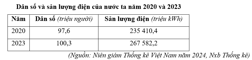Căn cứ vào bảng số liệu trên, hãy cho biết sản lượng điện bình quân đầu người của nước ta năm 2023 so với năm 2020 tăng thêm bao nhiêu kWh/người (làm tròn kết quả đến hàng đơn vị).