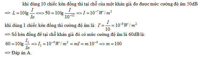 Trong một buổi hoà nhạc, khi dùng 10 chiếc kèn đồng thì tại chỗ của một khán giả đo được mức cường độ âm 50dB; Hỏi phải dùng bao nhiêu chiếc kèn đồng để tại chỗ khán giả đó có mức cường độ âm là 60dB?