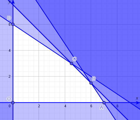 Thiết lập hệ bất phương trình ràng buộc và hàm lợi nhuận $P(x,y) = 50x + 40y$.