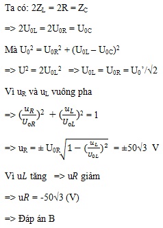 Đặt điện áp xoay chiều u = 100 √2cos(ωt) (V) vào hai đầu đoạn mạch gồm điện trở R nối tiếp với cuộn cảm thuần và tụ điện có 2ZL = 2R = ZC. Tại thời điểm điện áp tức thời trên cuộn cảm là 50 V và đang tăng thì điện áp tức thời trên điện trở là